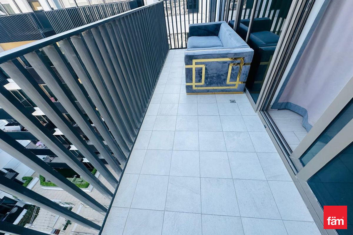 This spacious 814 sqft apartment features a contemporary open kitchen equipped with modern appliances and built-in wardrobes in both bedrooms. The unit is fully furnished and fitted with air conditioning and central AC to ensure year-round comfort. Enjoy stunning community views from the balcony situated on a high floor, providing an airy and bright living environment.