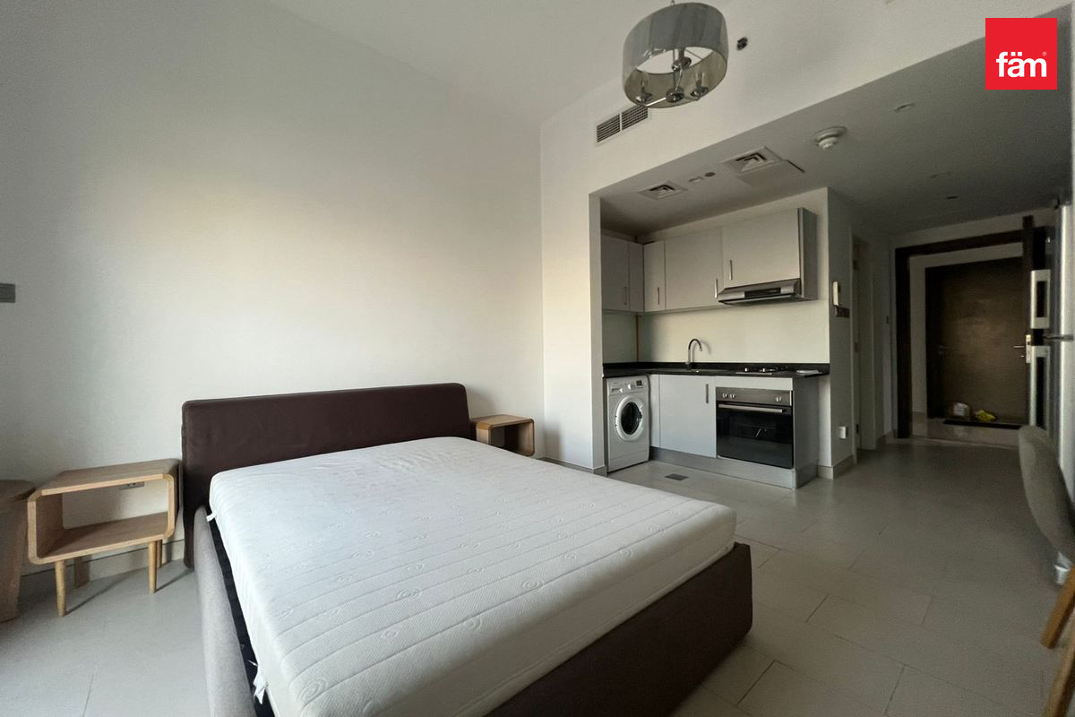 The studio features 1 bathroom, built-in wardrobes, kitchen appliances, a balcony, elevator access, fitted air conditioning, and an open kitchen. Residents can also enjoy access to a fitness center, shared gym, and shared pool within the building.