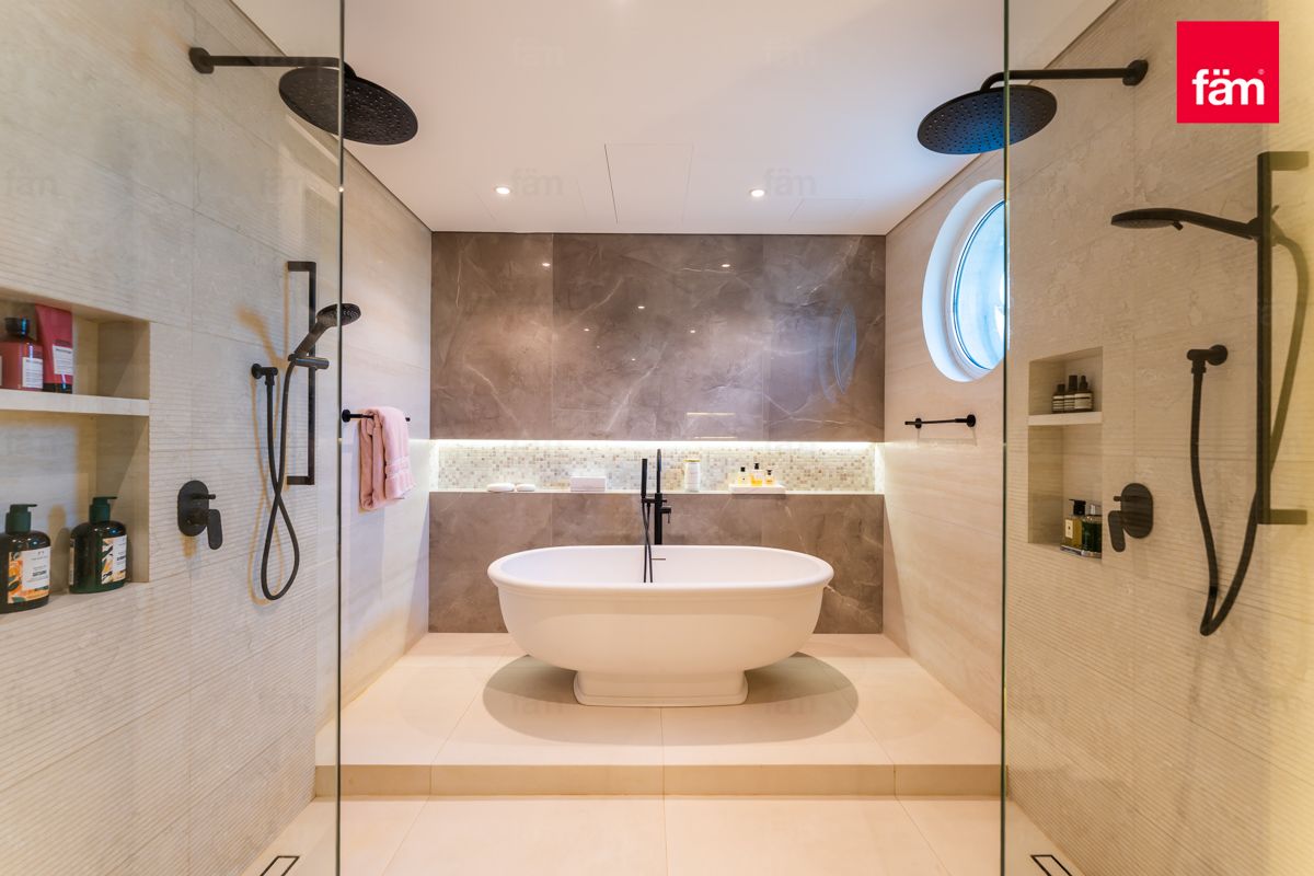 • Master bathroom redesigned with freestanding bathtub and ambient lighting
