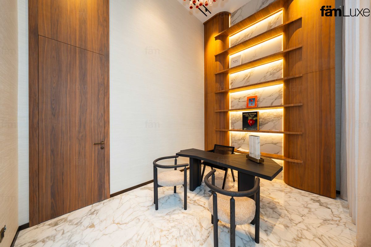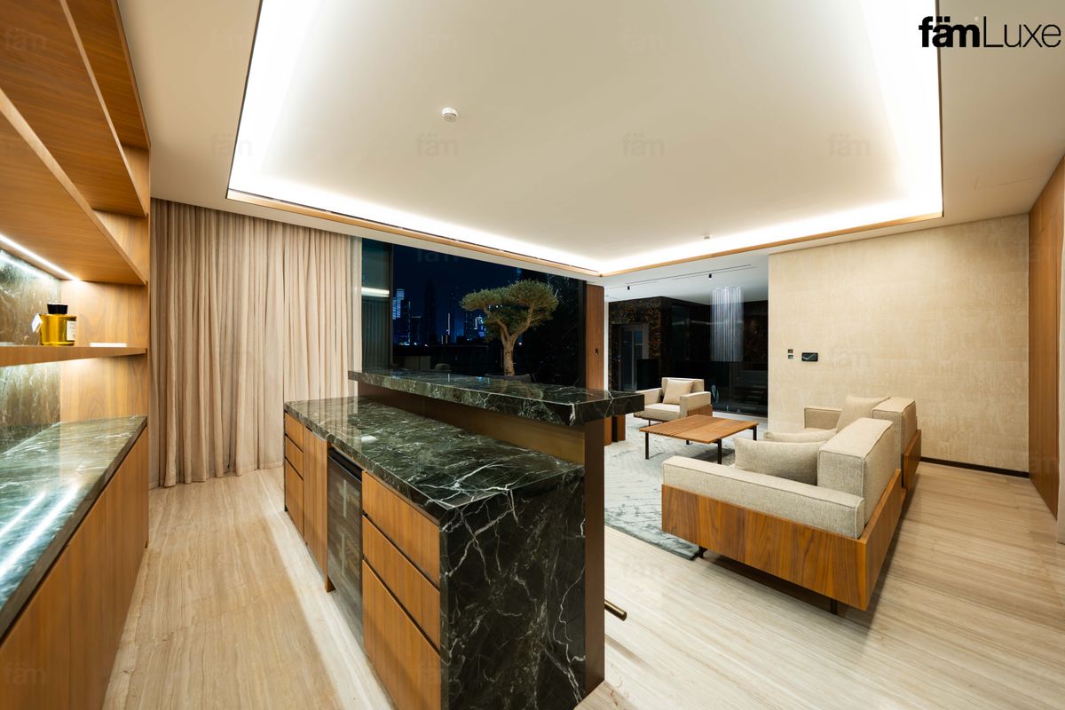 The villa features five expansive en-suite bedrooms, including a remarkable master suite. Select spaces capture open Burj Khalifa skyline views, a rare highlight for villas in this prime location.