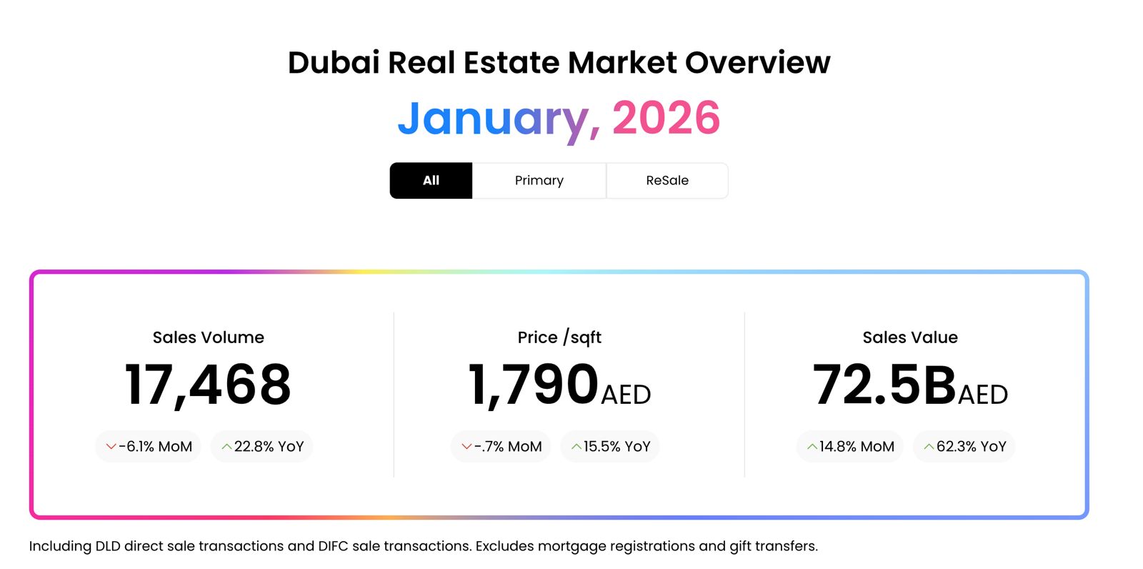 Отчеты о продажах DXBinteract включают проверенные транзакции прямых продаж DLD и транзакции продаж DIFC, зарегистрированные по полной цене покупки.