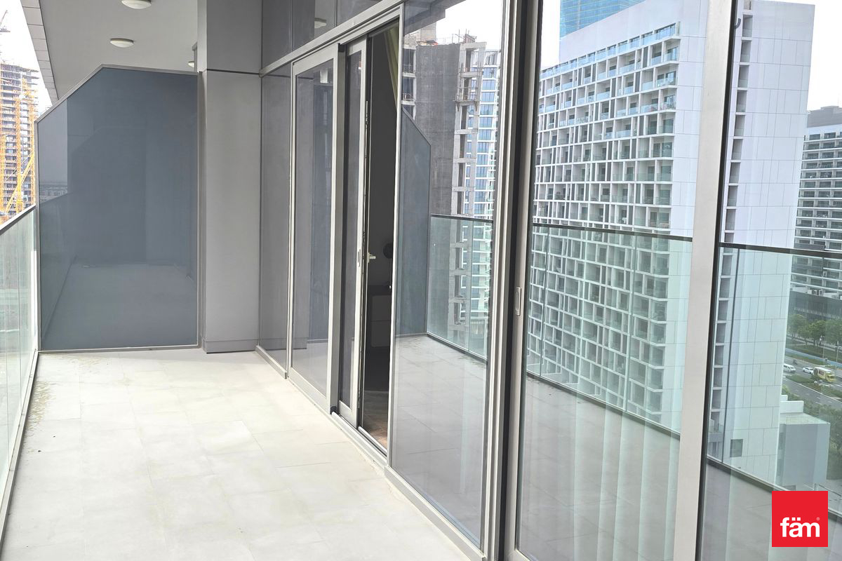 The spacious 970 sqft unit features an open kitchen fully equipped with modern appliances, built-in wardrobes, and a generously sized balcony overlooking the serene community. The layout includes two well-appointed bathrooms and a bright, airy living space, ideal for comfortable urban living.