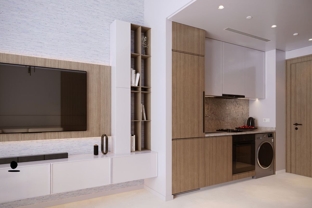 This brand-new, Vastu-compliant studio apartment spans 339.5 sq.ft and boasts a thoughtfully designed layout with built-in wardrobes, a walk-in closet, and a balcony providing partial fountain views. The property features a modern open kitchen equipped with essential kitchen appliances and is fitted with a smart home system, ensuring contemporary living standards.
