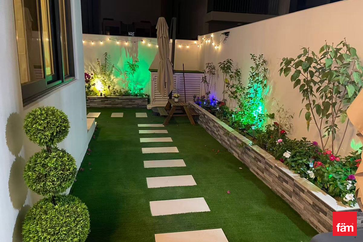 This meticulously maintained townhouse features built-in wardrobes, modern kitchen appliances, a maid’s room, and dedicated storage and laundry rooms for your convenience. Enjoy the comfort of central air conditioning and a private garden, perfect for relaxation and outdoor activities. The property also includes a balcony to appreciate the serene community surroundings.