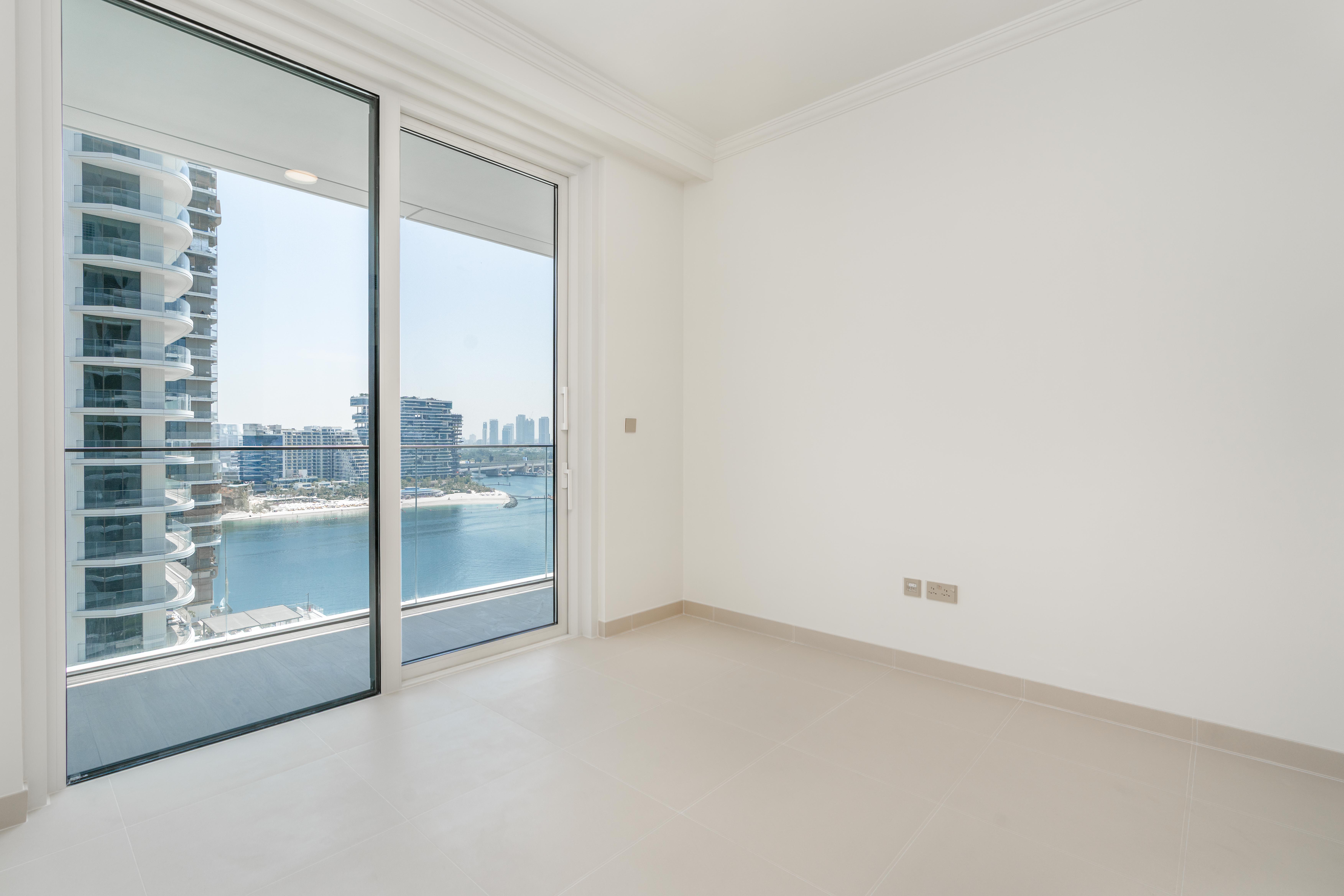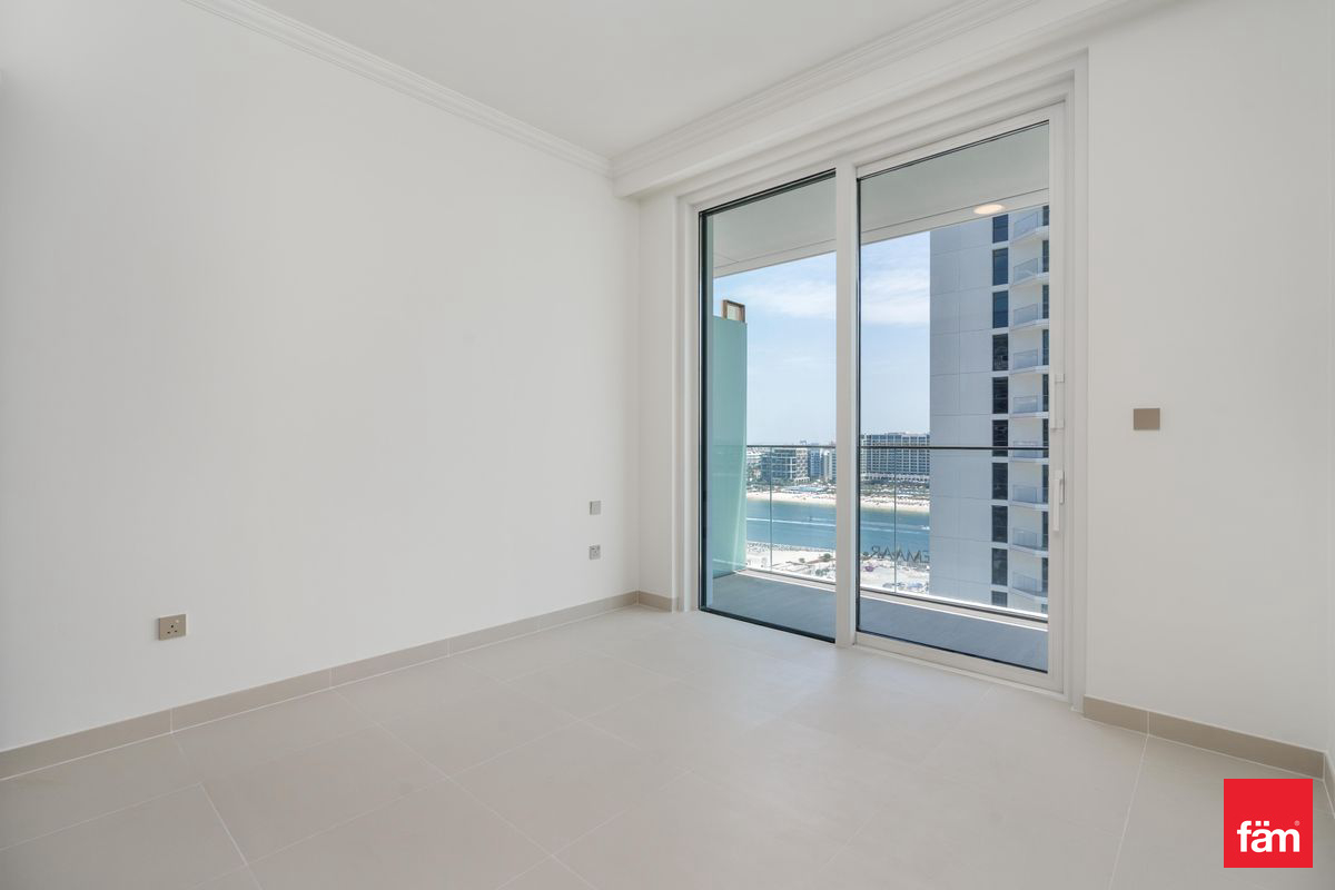 Boasting a spacious 851 sq.ft layout, this high-floor residence features an open kitchen design and an expansive balcony with stunning marina, ocean, and beachfront views. The apartment is unfurnished, providing a blank canvas for your personal touch. Built-in wardrobes and air conditioning ensure comfort and convenience.