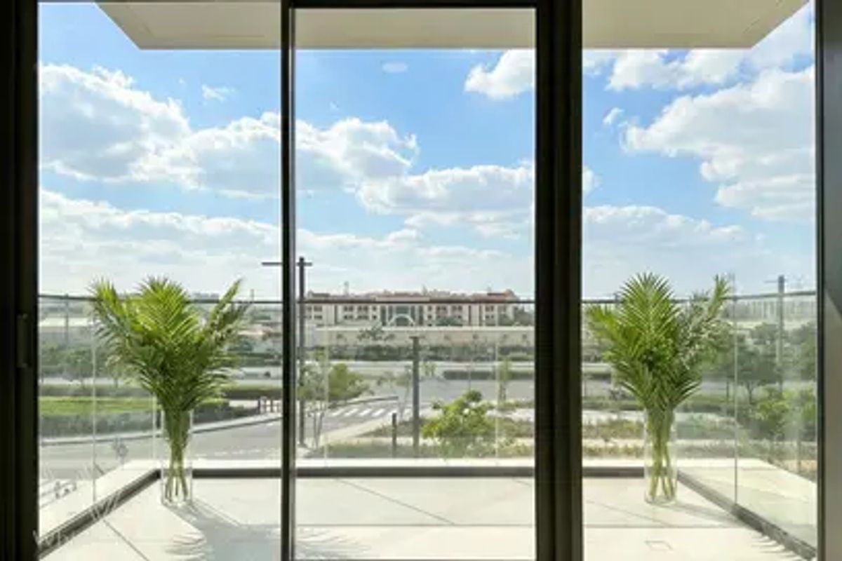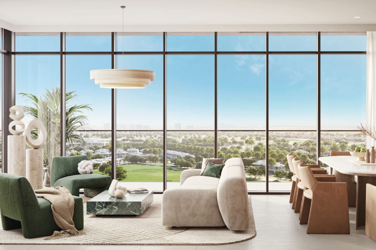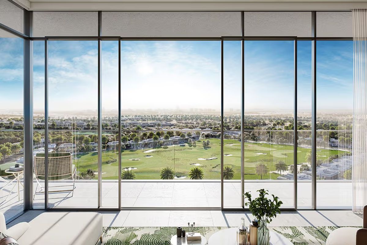 Inside, the property is finished with a clean, modern design, including floor-to-ceiling glass elements and a balcony that enhances natural light throughout the space. The building itself offers a high-quality lifestyle setup, including a fully equipped gym and a pool overlooking the golf course.