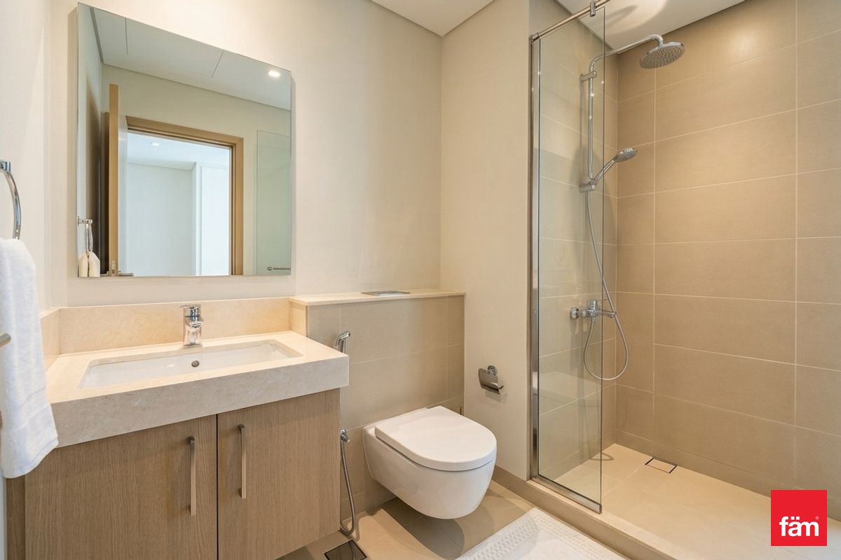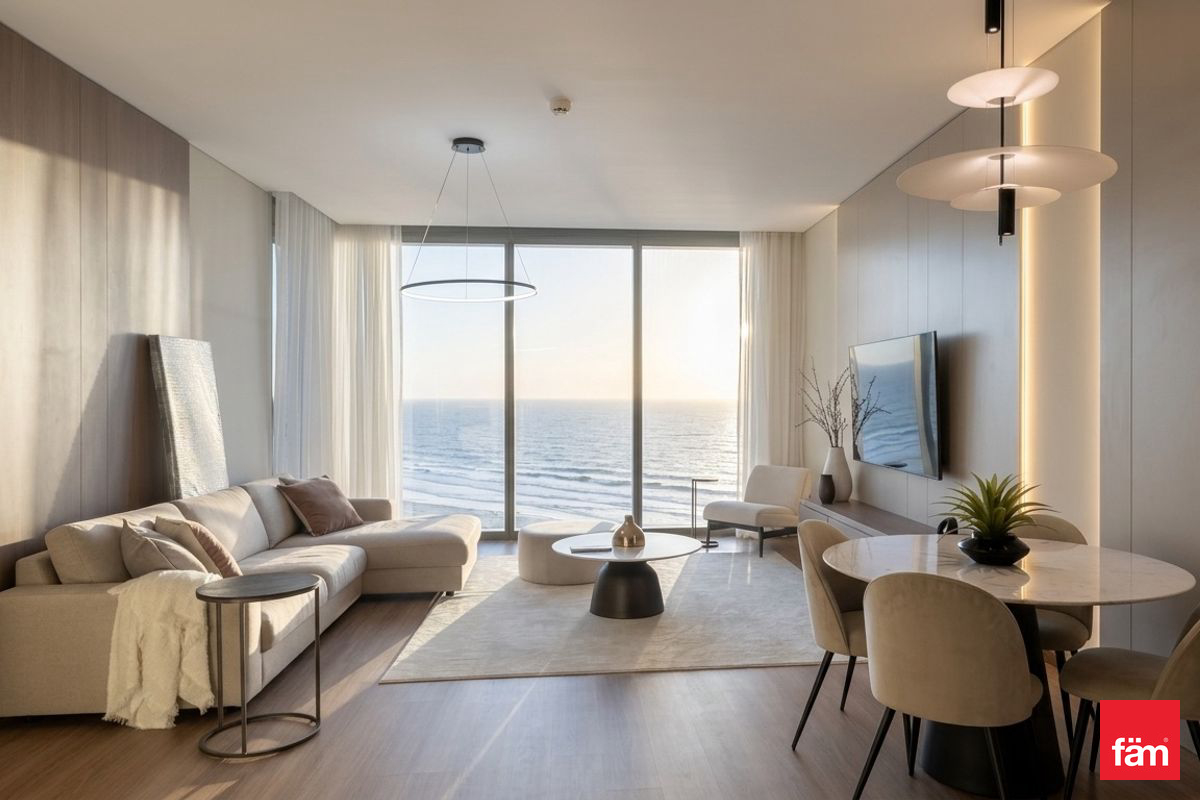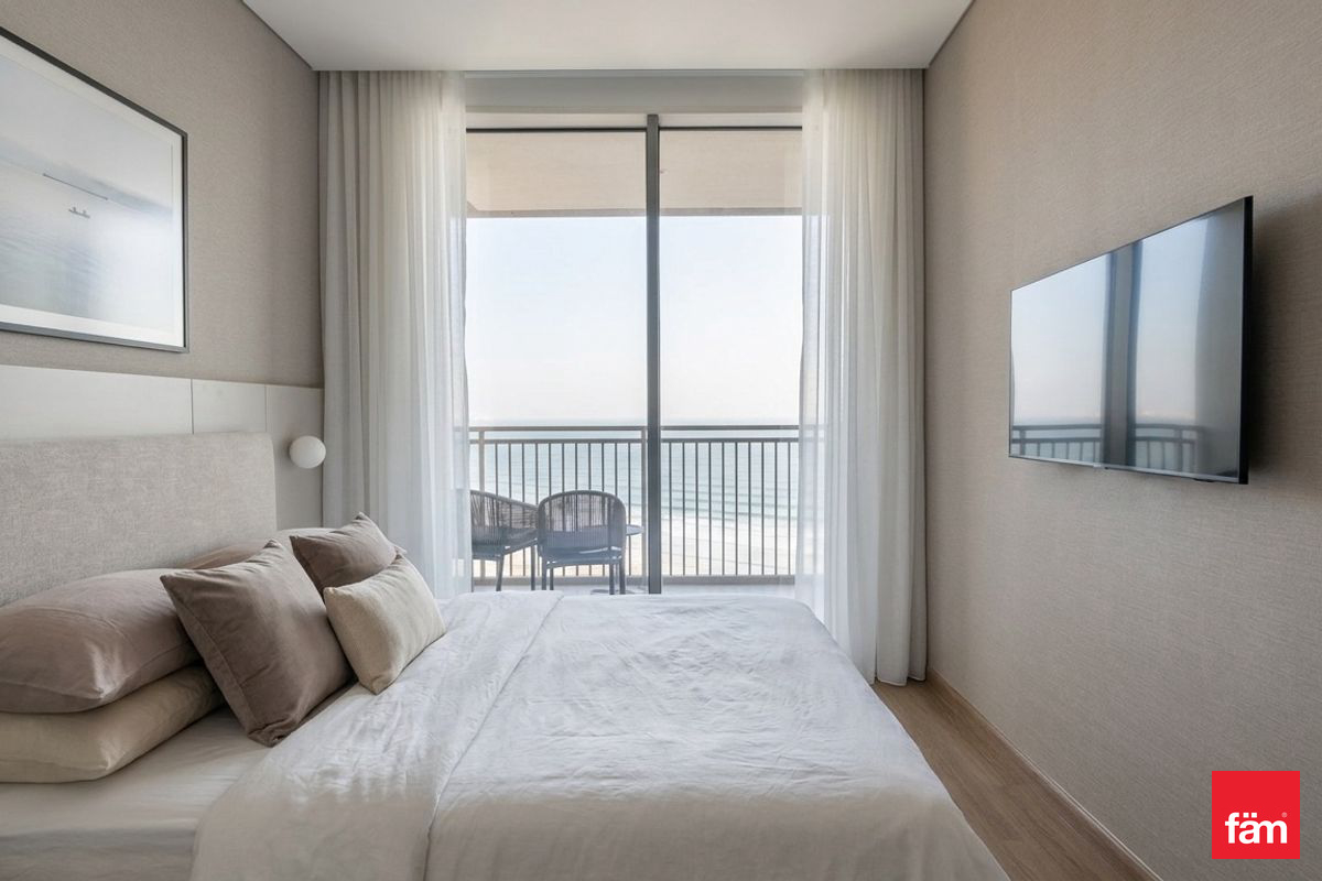 Located on a mid-floor, this apartment is ready for immediate occupancy. The residence features a contemporary living room with floor-to-ceiling windows, providing a naturally bright atmosphere and full sea views from every room. The semi-open plan kitchen is fully fitted and equipped. Both bedrooms are spacious with fitted wardrobes, and the apartment includes well-appointed bathrooms. Additional features include covered parking and chiller-free living.