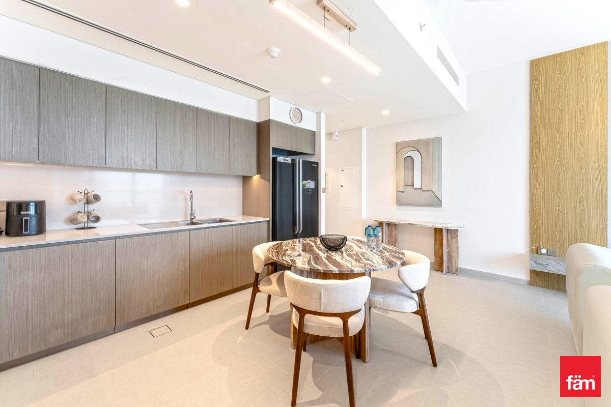 This beautifully designed residence offers breathtaking panoramic views of the city skyline and Burj Khalifa, featuring floor-to-ceiling windows that fill the space with natural light. The layout includes a spacious living and dining area, a modern open-plan kitchen, and two elegantly finished bedrooms with built-in wardrobes.