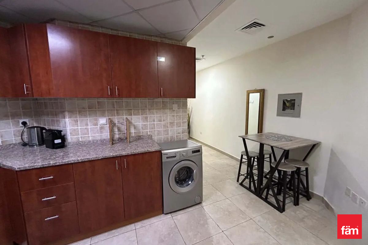 The studio features one modern bathroom and enjoys a serene community view, providing a comfortable and peaceful living environment. The apartment includes built-in wardrobes and kitchen appliances, complemented by an open kitchen layout and a private balcony.