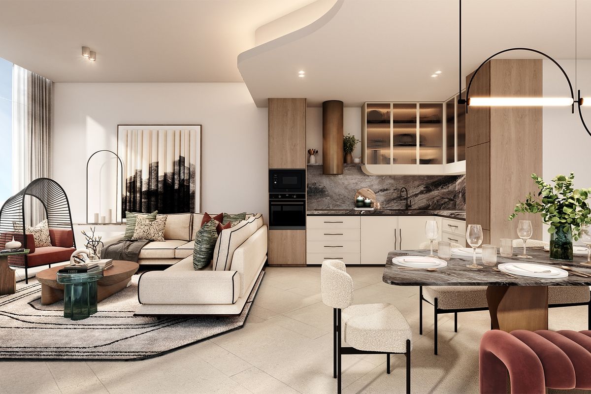 The living rooms showcase high ceilings, creating a sense of openess and grandeur, while floor to ceiling double glazed vsion panels allow for abundant natural light and uninterrupted views. Private balconies create a seamless indoor-outdoor living experience. Floors are adorned with patterned tile adding both texture and sophistication to the space. The blend of premium materials and open, airy design create a warm ambience, perfect for both relaxation and entertaining.