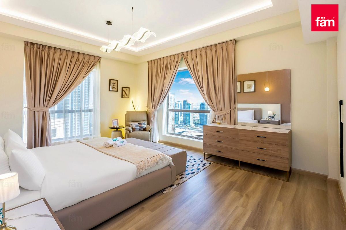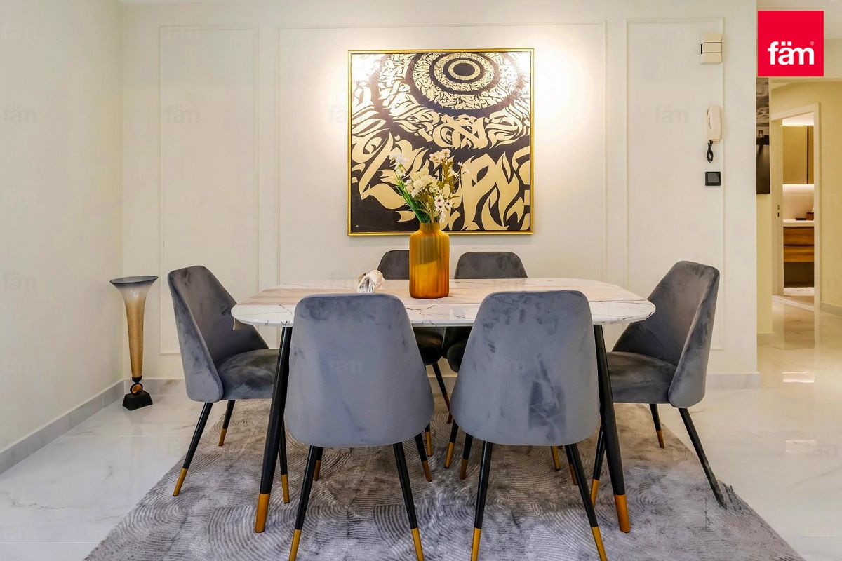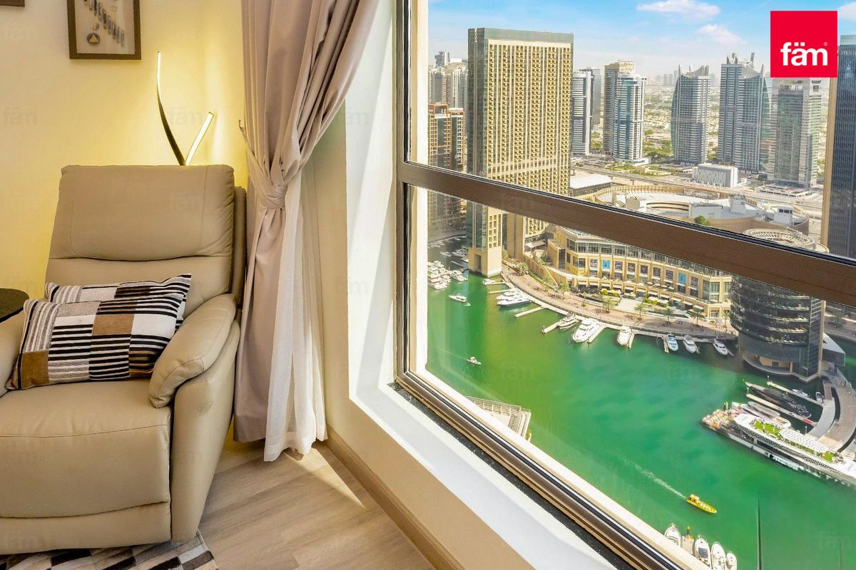 Floor-to-ceiling windows frame stunning views of Dubai Marina, filling the home with natural light and creating a serene waterfront ambience. The upgraded kitchen is fully equipped with high-quality appliances, while both bedrooms are designed to comfort, featuring built-in-wardrobes and refined finishes.