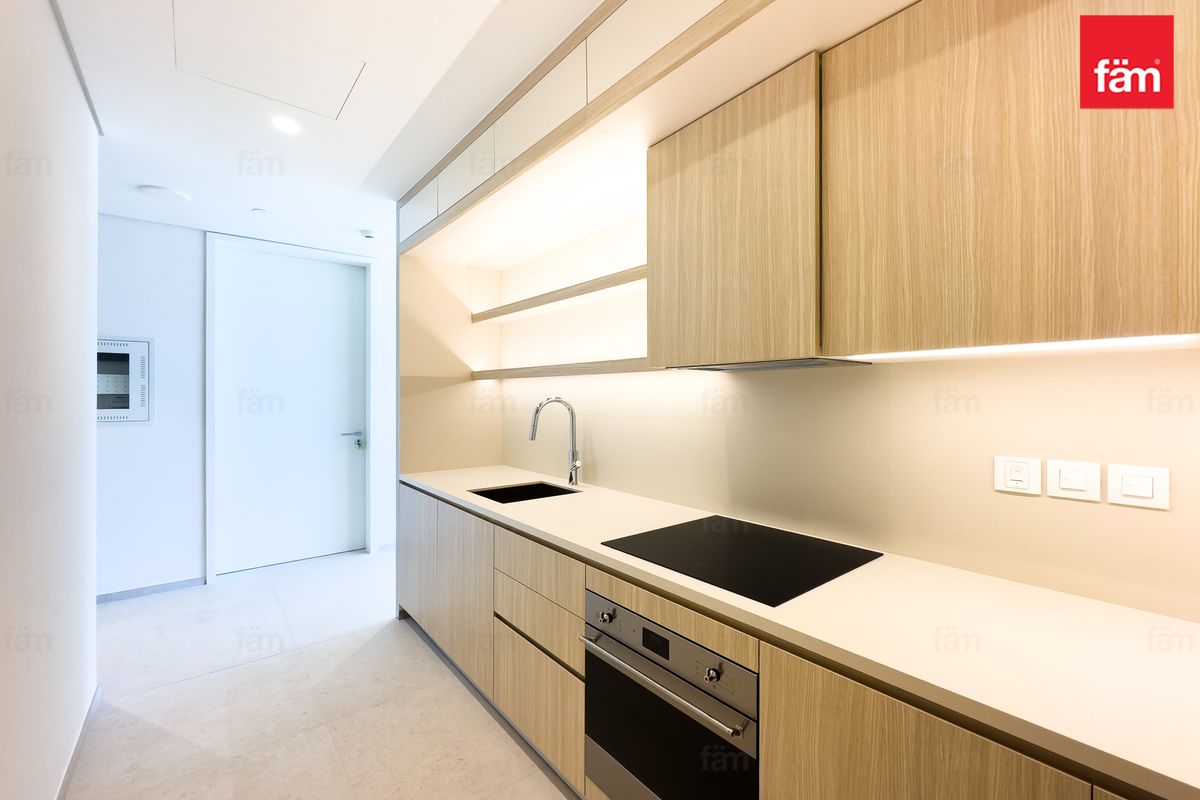 The modern kitchen is fitted with high-end appliances and sleek cabinetry, seamlessly blending style and functionality. The bedroom offers a tranquil retreat with built-in wardrobes and a beautifully designed en-suite bathroom finished with superior materials and elegant fixtures.