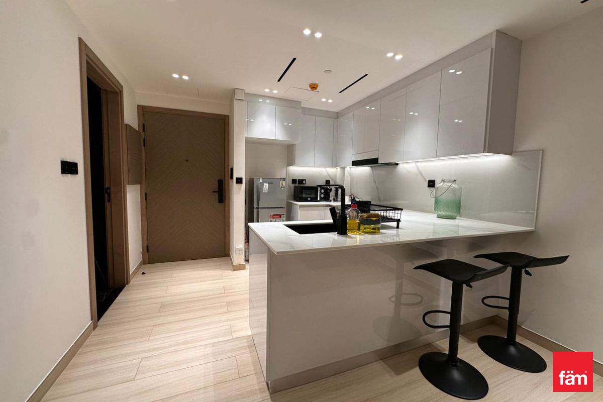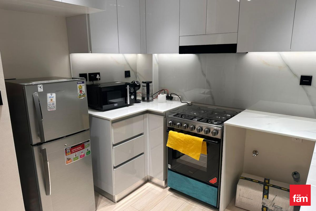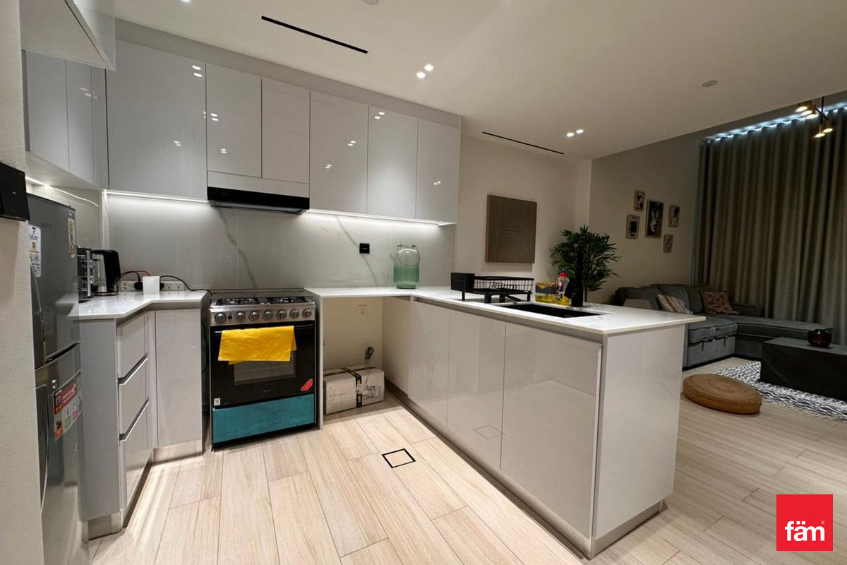 The apartment features a well-designed living and dining area furnished with modern, high-quality furniture. The corner layout provides extra windows, ensuring better ventilation and brightness throughout the day. The open-plan kitchen is fully equipped with built-in appliances, ample storage, and sleek cabinetry, ideal for daily use.