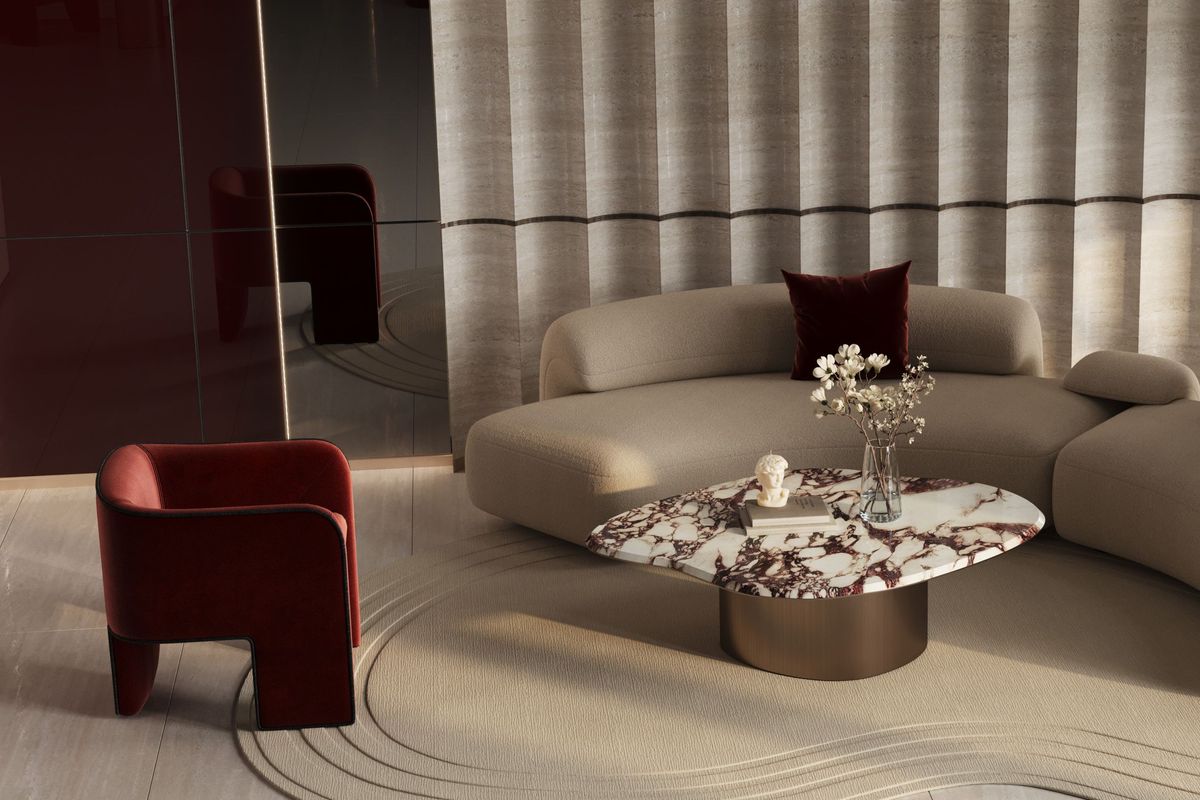 Rich interiors featuring travertine marble, porcelain tiles, and ruby glass