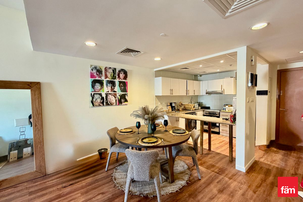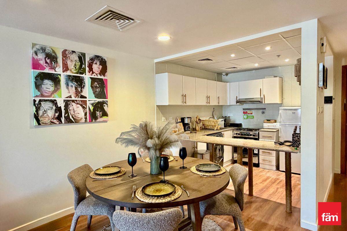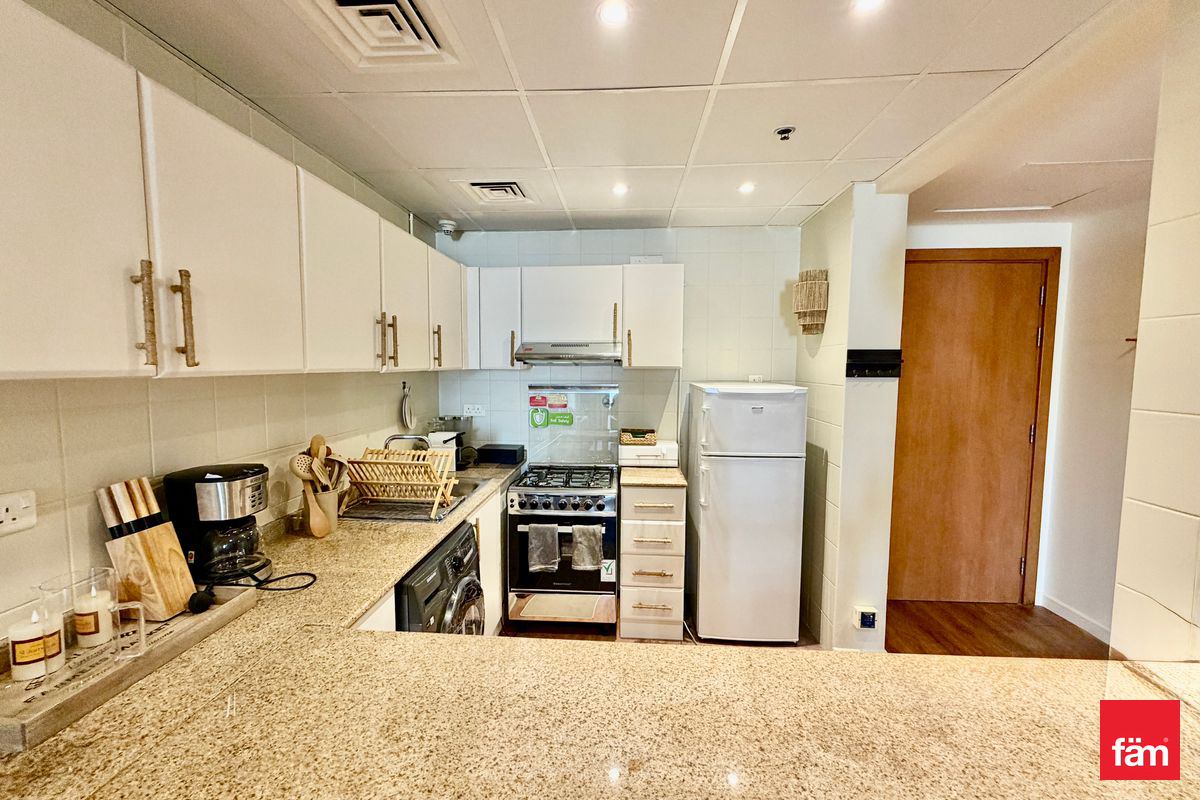 This elegantly designed apartment offers a comfortable living experience featuring an open kitchen equipped with modern appliances and built-in wardrobes, ensuring ample storage space. The balcony provides a serene community outlook, perfect for relaxation.
