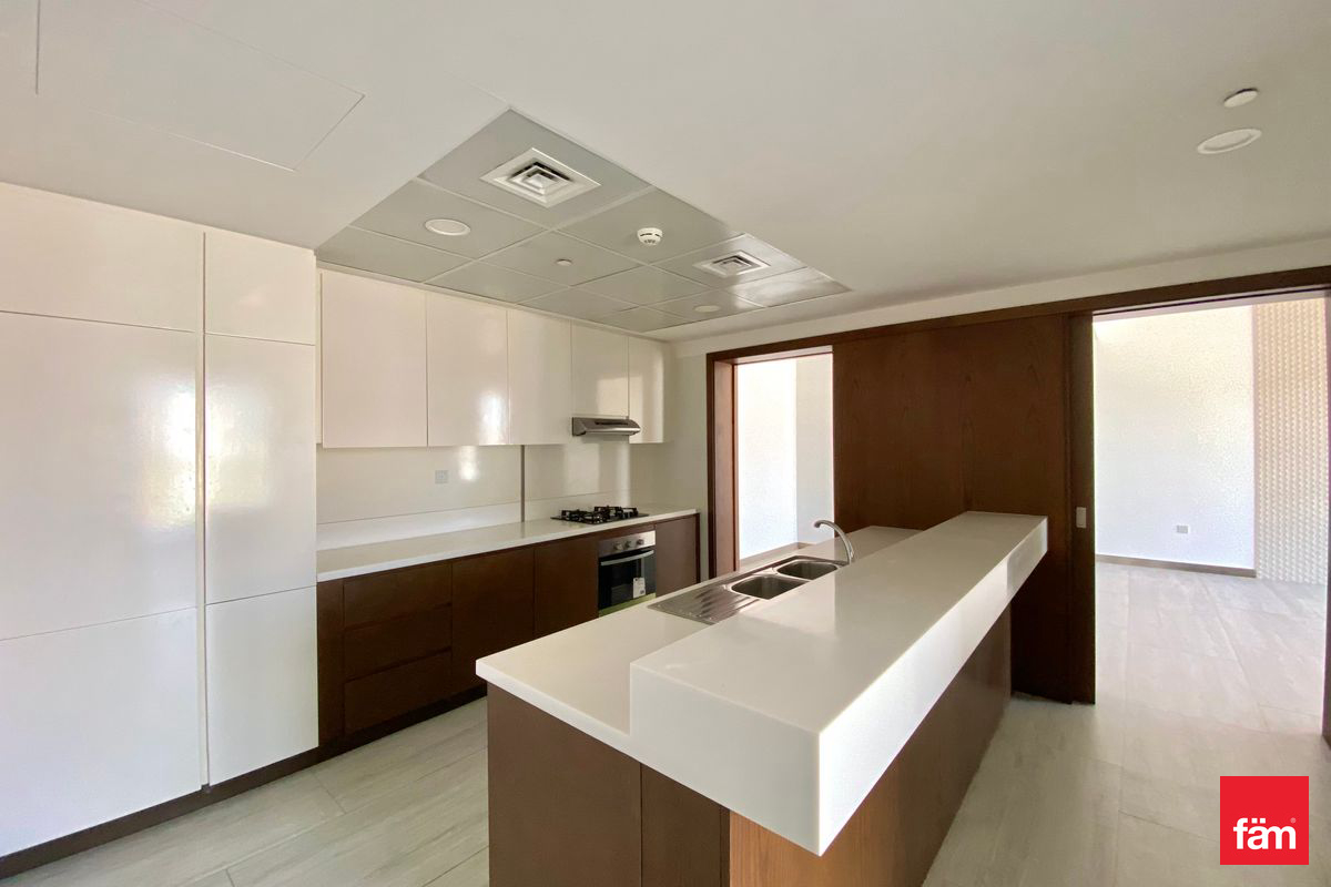 The apartment features three bathrooms, an open kitchen equipped with built-in kitchen appliances, and built-in wardrobes in the bedrooms. The layout includes a private balcony that overlooks the serene community, providing a tranquil environment and landmark views. Additional conveniences include a dedicated laundry room and air conditioning throughout.