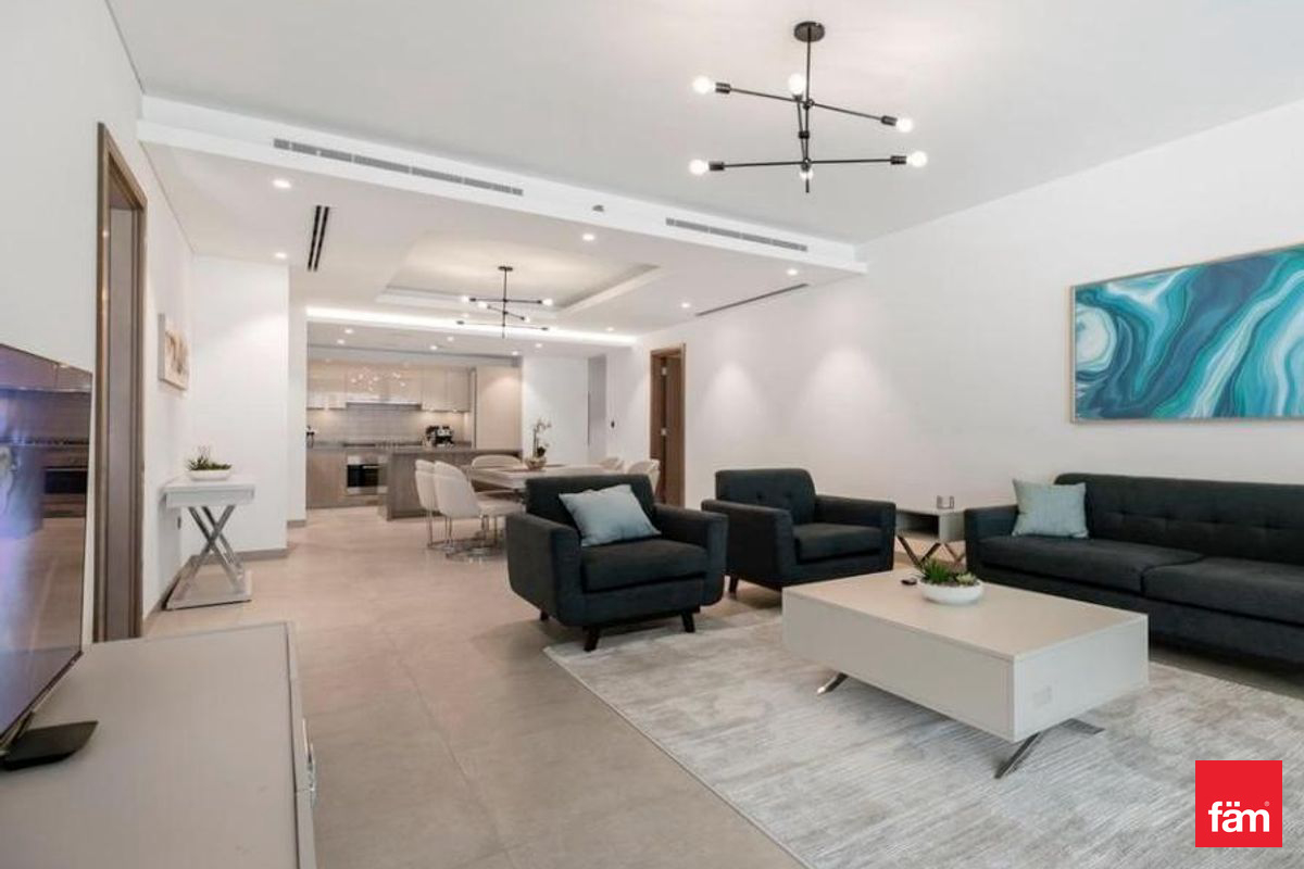 fäm Properties proudly offers this fully furnished apartment in Waves Grande, Sobha Hartland, ideal for comfortable family living. The apartment features a spacious layout with contemporary furniture, a fully equipped open kitchen, and elegant bathrooms. Large floor-to-ceiling windows fill the space with natural light, while the master bedroom includes a private en-suite. A maid’s room with attached bathroom adds extra convenience. Property Details: • Bedrooms: 3 plus Maid’s Room • Bathrooms: 4 • Furnishing: Fully furnished with high-quality furniture • Community: Sobha Hartland, Mohammed Bin Rashid City Key Features: • Spacious living and dining area • Modern kitchen with appliances • Built-in wardrobes • Balcony with open community/greenery views • Elegant interiors and bright layout Amenities: • Infinity swimming pool • Fully equipped gym • Landscaped gardens and walking tracks • Children’s play area • 24/7 security • Covered parking Prime Location: • 10 minutes to Downtown Dubai • Easy access to DIFC and Business Bay • Close to international schools and hospitals Contact us for a viewing