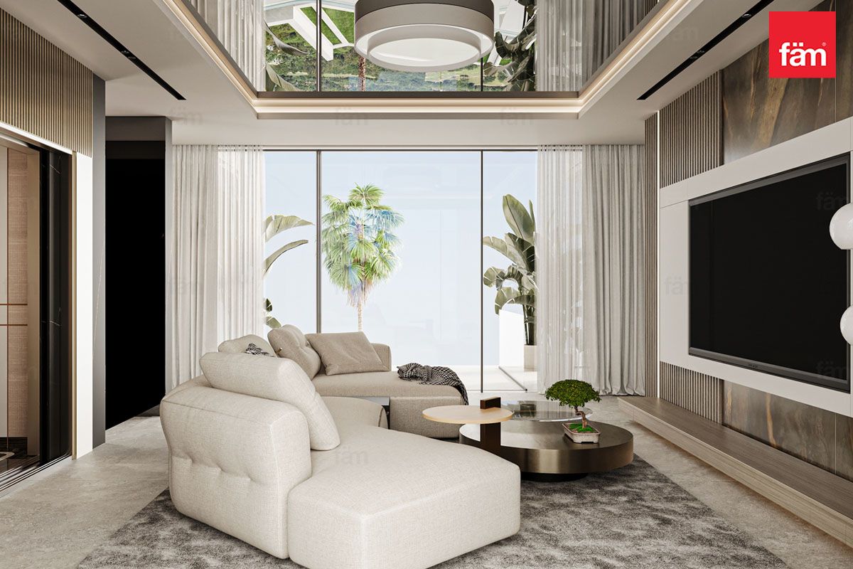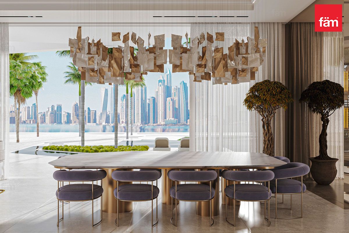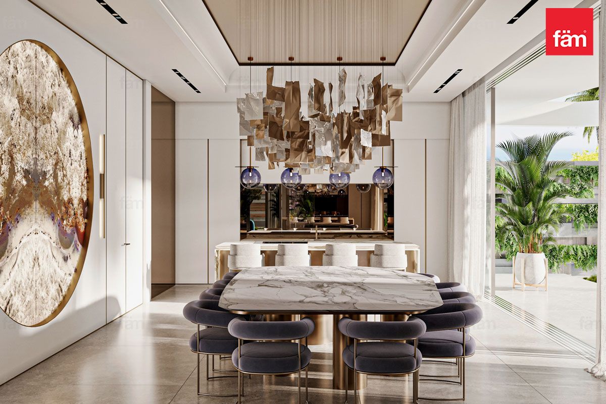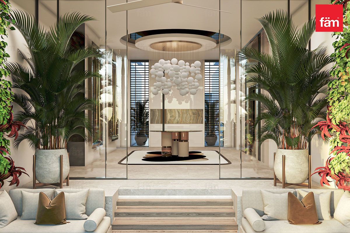 Inside, the open-plan layout connects living, dining, and entertainment areas, perfect for elegant gatherings. The interiors balance polished marble floors, statement chandeliers, plush lounges, and intricate detailing, blending contemporary style with heritage.