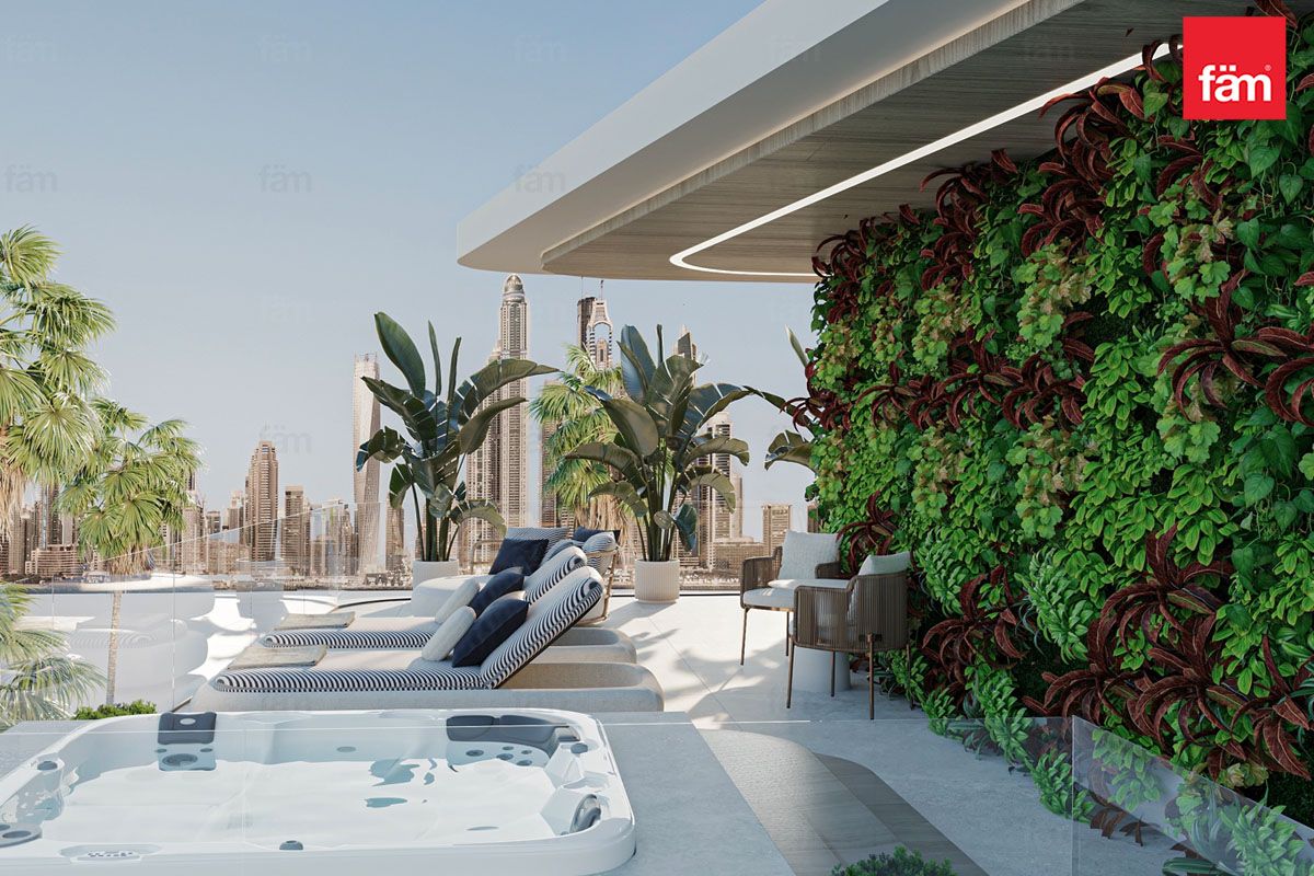 It offers private resort comforts: a rooftop terrace with sea and skyline views, a sky garden or jacuzzi, and smart home technology that controls climate, security, and lighting.